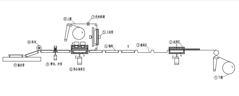 2、設(shè)備前端(上)(成型區(qū)域) 由成型模具和上加熱模具組成,使下膜成型成所設(shè)定形狀。 |