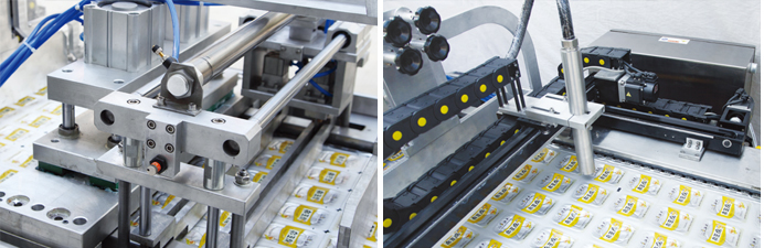 4、設(shè)備中部(封口和真空區(qū)域) 由封口模具和上加熱模具,設(shè)備通過(guò)步進(jìn)到達(dá)封口真空區(qū)域,下膜模具通過(guò)氣缸上升、壓緊上加熱模具,再通過(guò)真空管路進(jìn)行抽真空,最后完成封口。 |