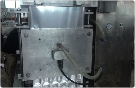 4、設(shè)備中部(封口和真空區(qū)域) 由封口模具和上加熱模具,設(shè)備通過(guò)步進(jìn)到達(dá)封口真空區(qū)域,下膜模具通過(guò)氣缸上升、壓緊上加熱模具,再通過(guò)真空管路進(jìn)行抽真空,最后完成封口。 |
